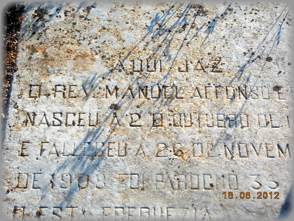 Aqui Jaz Thereza Affonsa irmã do Rev. Padre Affonso natural da freguesia de Alcaria. Nasceu a 20 de Setembro de 1823 e faleceu a 25 de Julho de 1905. Pede um Padre Nosso.