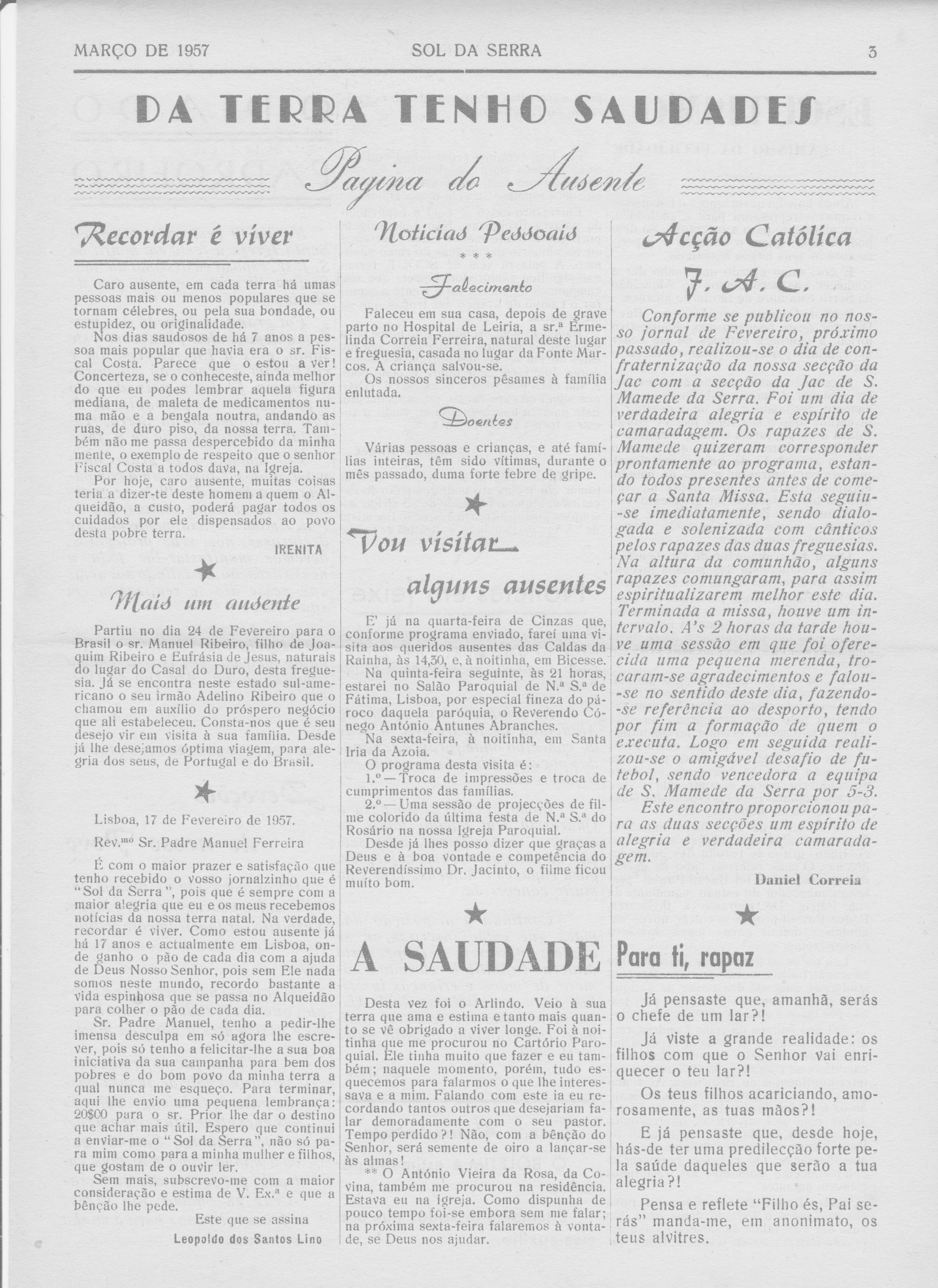 O Sol da Serra nº.10 de Abril de 1957 com a noticia do falecimento da mãe da Ermelinda